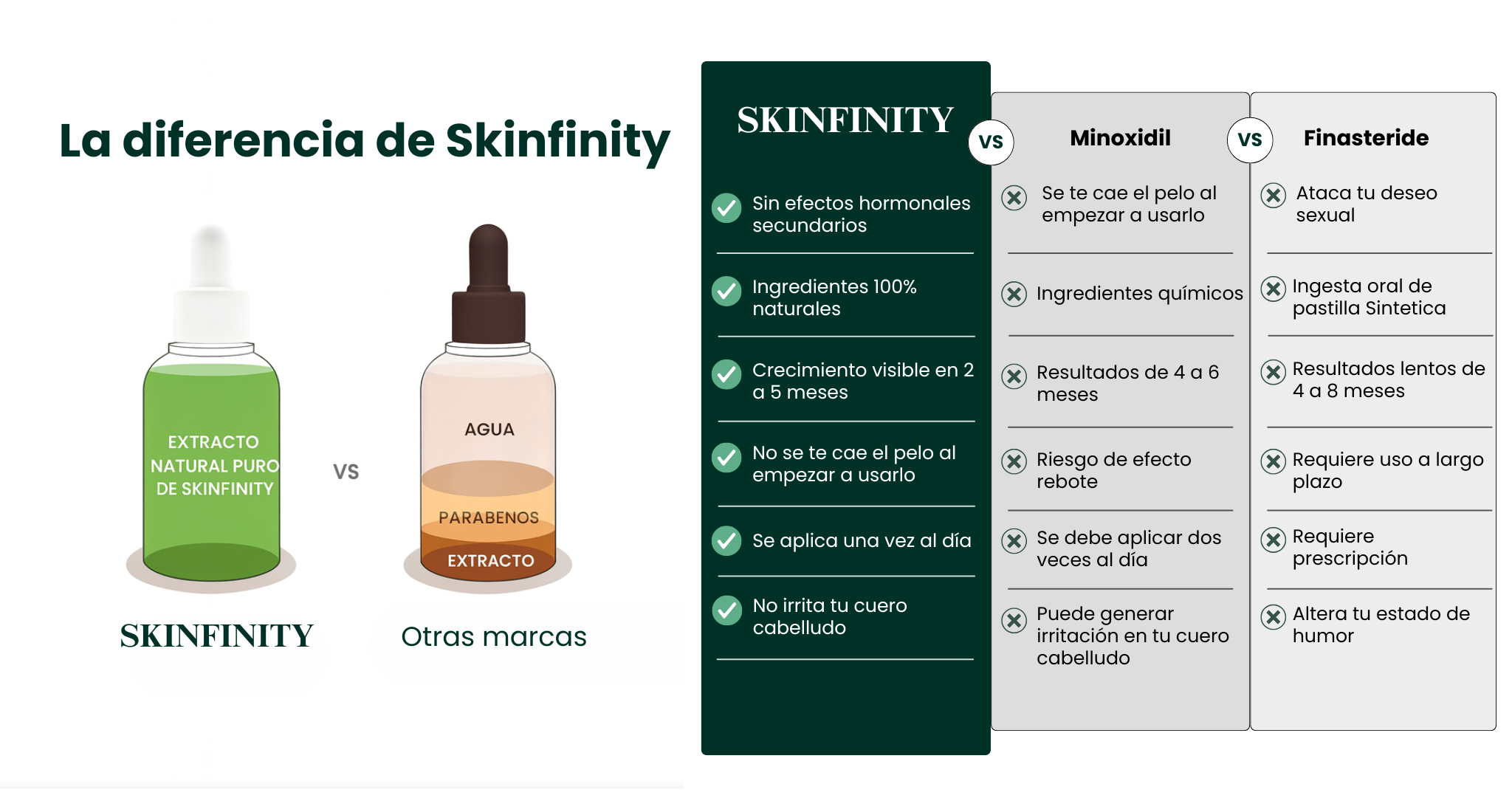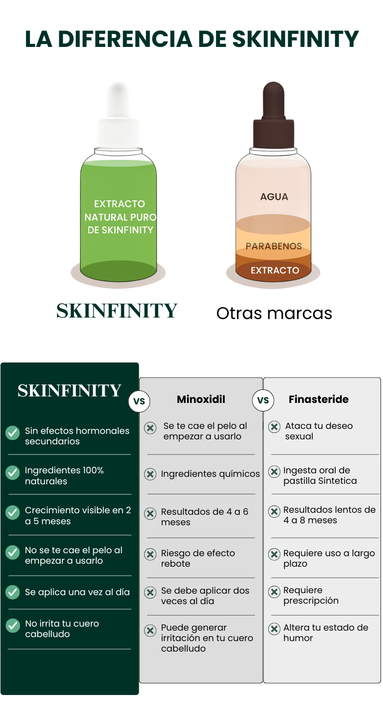 Sí. La diferencia de Skinfinity es que actúa sobre las dos causas principales: exceso de DHT e inflamación del cuero cabelludo. La fórmula natural bloquea el DHT y estimula la microcirculación para resultados reales.